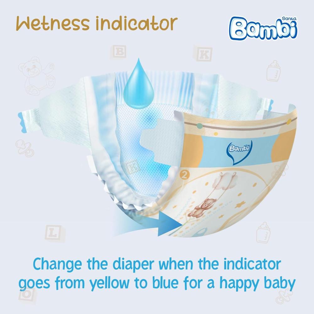 تتميز الحفاضات بطبقة مضغوطة ومنقوشة عالية الامتصاص التي تحتجز الرطوبة بعيداً لضمان الجفاف والراحة القصوى. بالإضافة إلى ذلك، يحتوي الحفاض على مؤشر للبلل الذي يتحول من الأصفر إلى الأزرق لإعلامك بوقت التغيير.