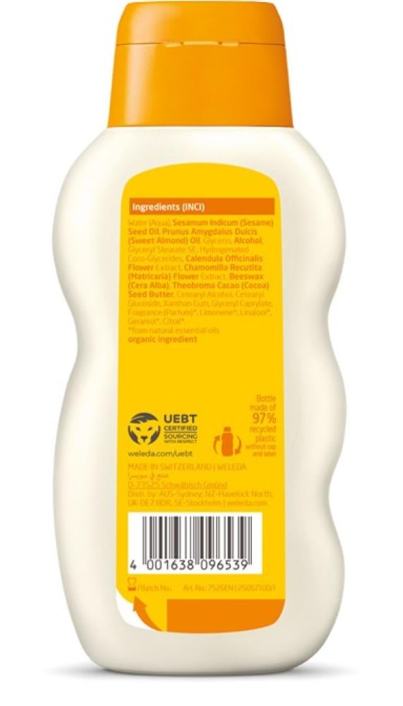 مستخلصات زهرة القطيفة المستخرجة من الزراعة العضوية المدارة لطيفة جداً على البشرة. كما أن مجموعة متنوعة من الزيوت النباتية النقية تعتني بالبشرة بلطف، مما يساعد على تكوين درع واقي دافئ. وبالتالي، يمكن لبشرة الأطفال أن تتطور بأفضل شكل ممكن.