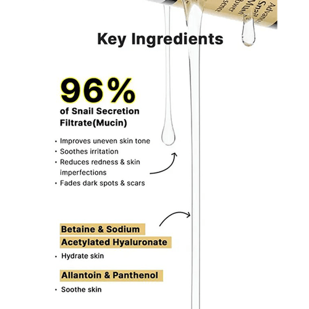 مرشح إفراز الحلزون (Snail Secretion Filtrate)، البيتين، بوتيلين جلايكول، 1،2-هيكسانيديول، هيالورونات الصوديوم، بانثينول، أرجينين، ألانتوين، إيثيل هيكسانيديول، بولي أكريلات الصوديوم، كربومير، فينوكسي إيثانول.